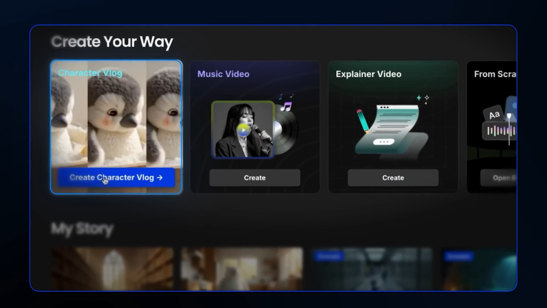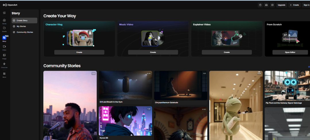 使用 Open Art只要一个指令就能创建动画。打开Open Art,点击故事,能看到四种不同类型的故事可以创作。