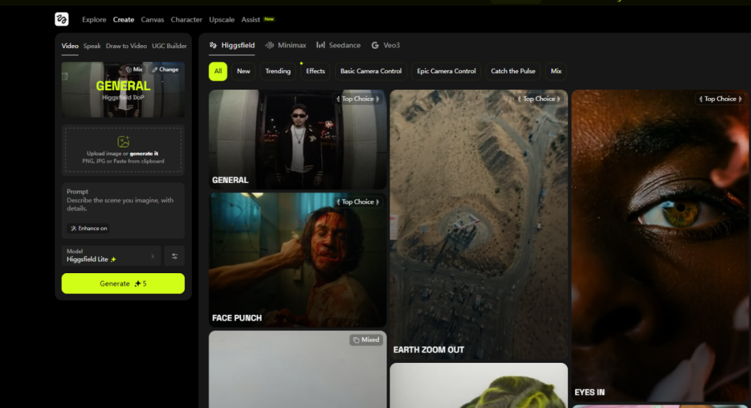 下面再看看右眼渐入的视频特效。只要点击创建,选择视频,点击这里的更换,就能看到所有可用特效。因为我想要眼睛放大特效,就在搜索框里输入“眼睛”,然后选这个特效。上传图片和指令,结果就出来了。