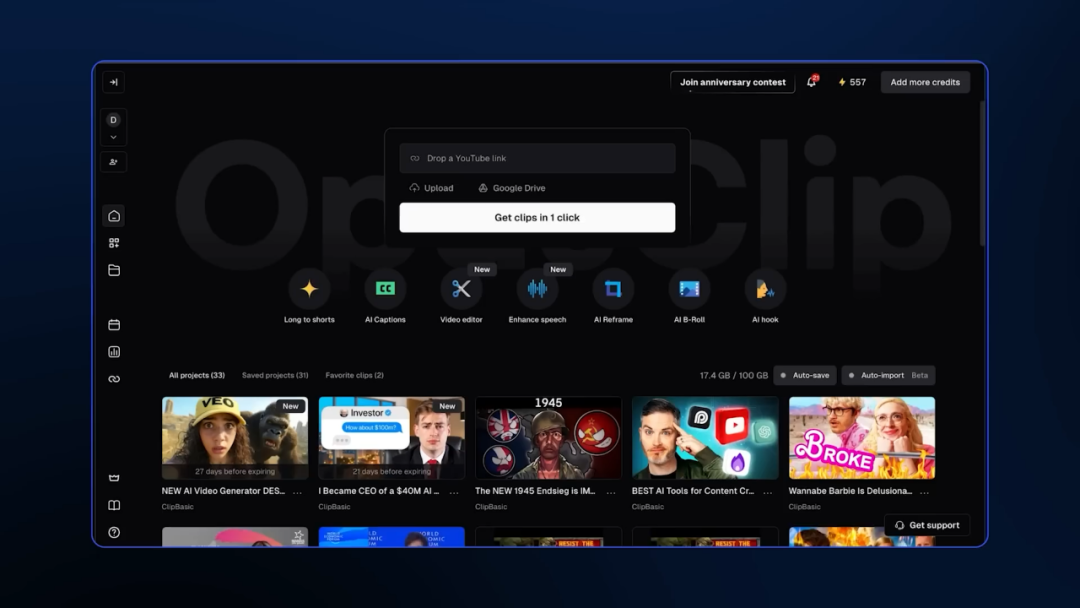 这个工具能在几分钟内把长内容变成短视频。剪辑视频很费时间,要看完内容,保存有趣的片段,编辑视频,添加字幕。有了Opus Clip,只要复制YouTube视频的链接,把链接放这儿。