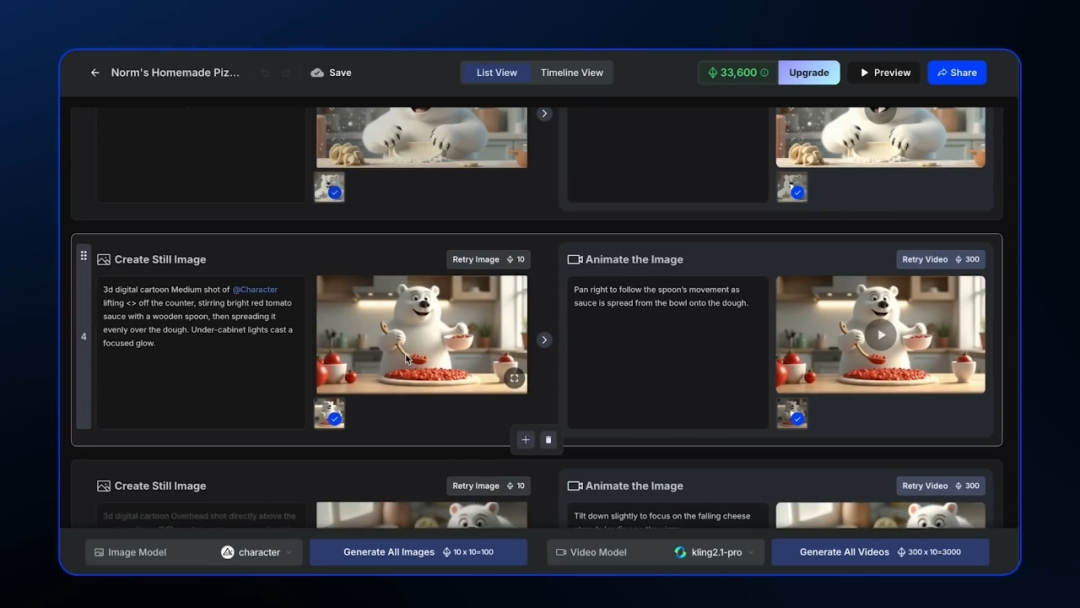 整个动画只用一个指令就做出来了,太牛了。不然就得雇一个动画师团队。要是你不喜欢某个场景,比如觉得这个镜头很怪,它的脚碰到面团了。你可以点击编辑这个故事,就会进入内置编辑器。有个选项很棒,点击列表视图,就能看到场景排列好了。