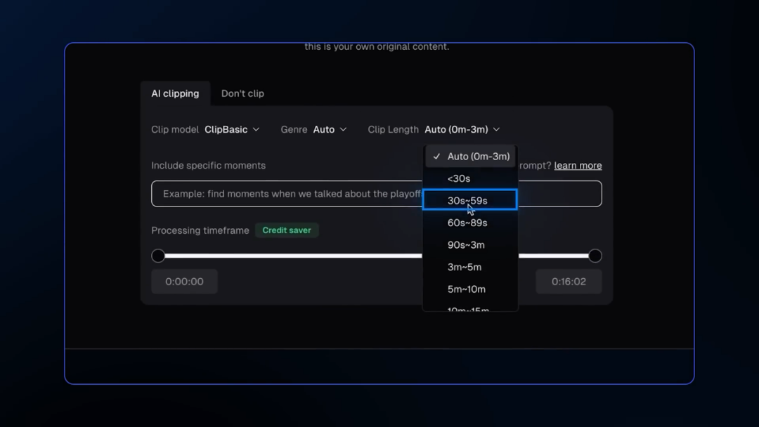 希望剪辑出来的视频时长在30到60秒,长宽比选9比16。预设选项有很多。