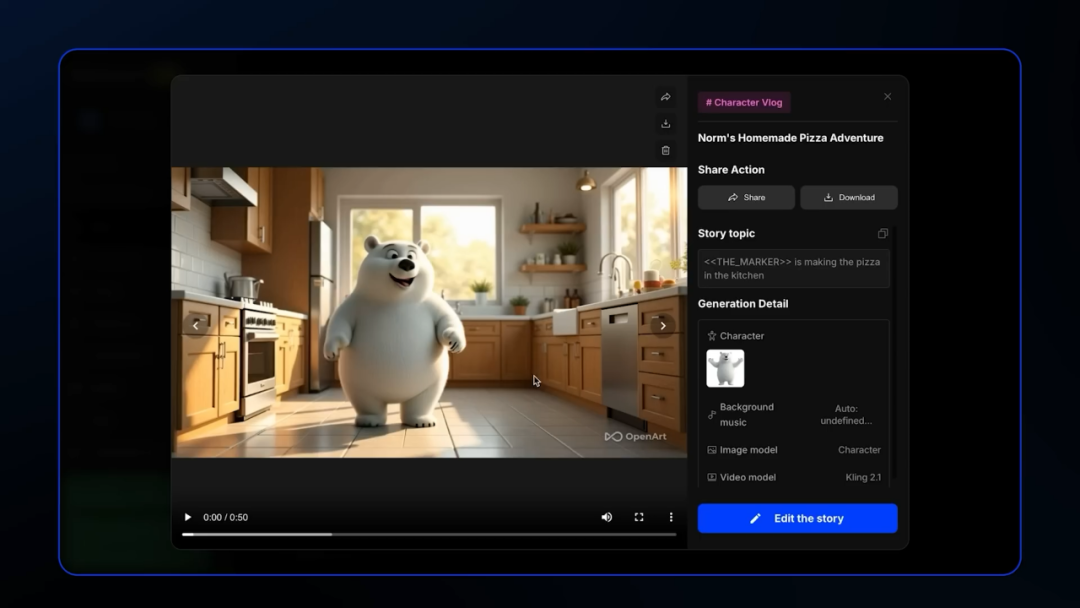 对于指令,你可以让角色做任何你想让它做的事。这里有预设指令,像购物、做饭。我试试做饭的预设。长宽比保持16比9,背景音乐选自动。高级设置里,图片模型不变,视频模型换成Kling 2.1 Pro,这样效果最好。点击创建故事,结果就出来了。