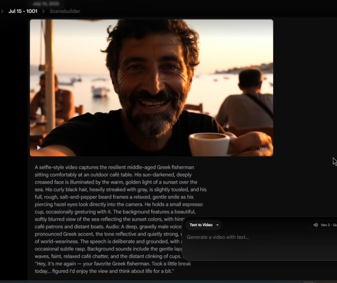我再测试一下一致性,回到Gemini,让它生成另一个场景的提示。我输入“用你刚创建的核心提示,为我们的角色写一个自拍vlog风格的Veo3提示,内容是他在日落时坐在海边咖啡馆外,拿着一个小杯子,微笑着对着镜头说‘嘿,又是我,你们最喜欢的希腊渔夫。今天休息了一下,想欣赏下风景,思考下人生’”,然后点击生成。