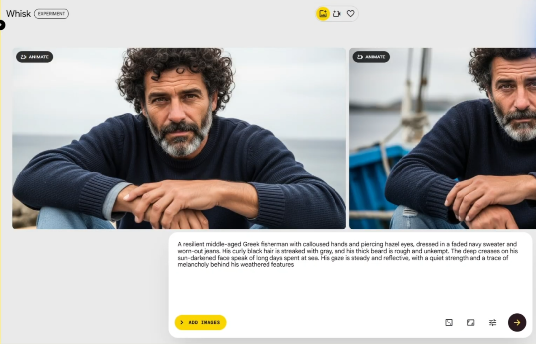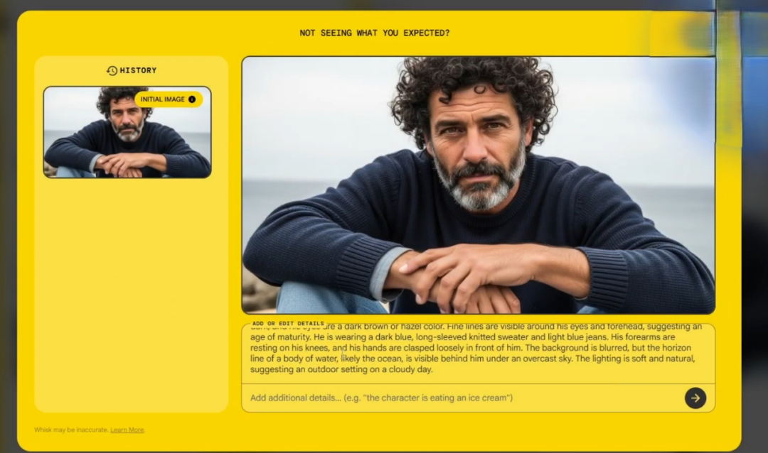 你能看到,生成的角色跟我描述的一模一样,中年、希腊人的长相,渔夫的样子。这就是我们整个过程都会用到的基础角色。要是你不喜欢生成的结果,可以点击“优化”来编辑,还能添加额外细节,比如给他加副眼镜、戴顶帽子,或者改变其他特征。之后,我们做的每个视频都会围绕在Whisk里创建的这个角色。