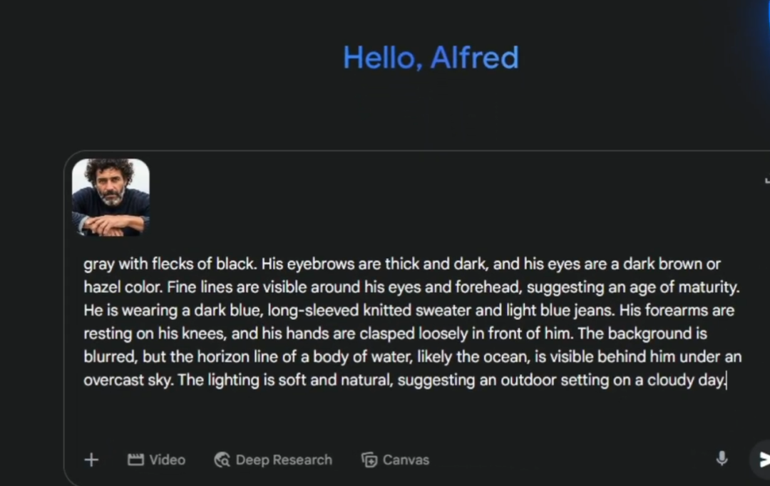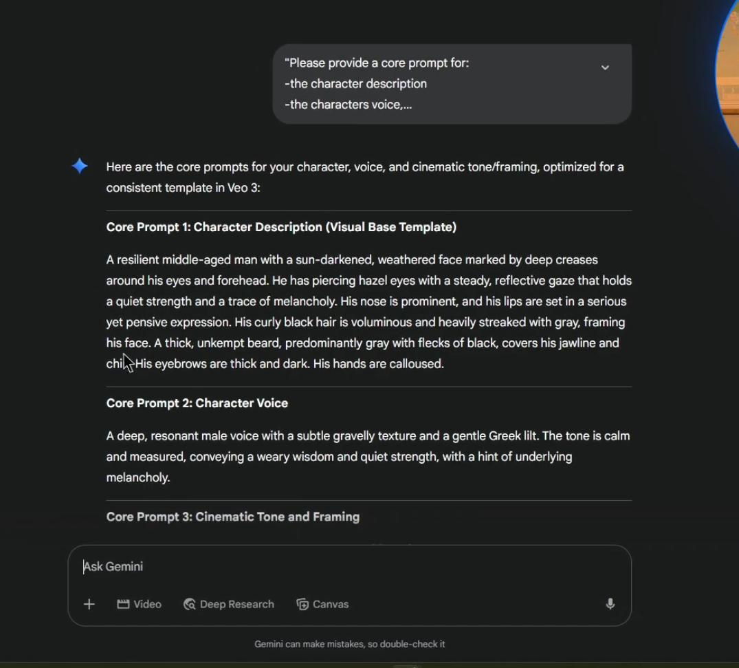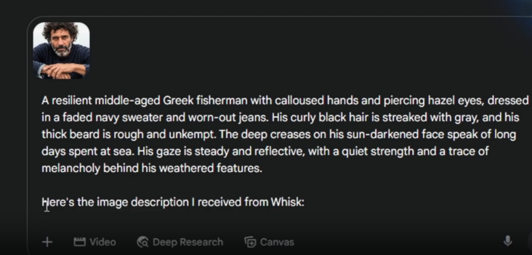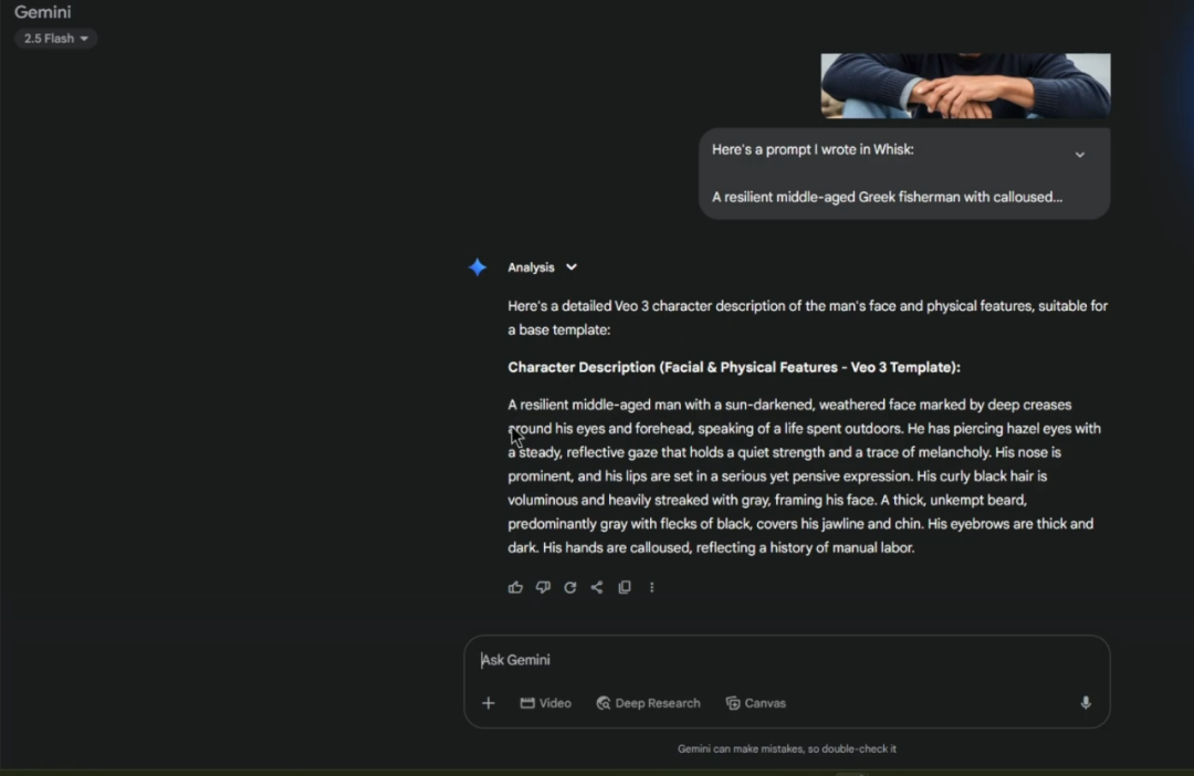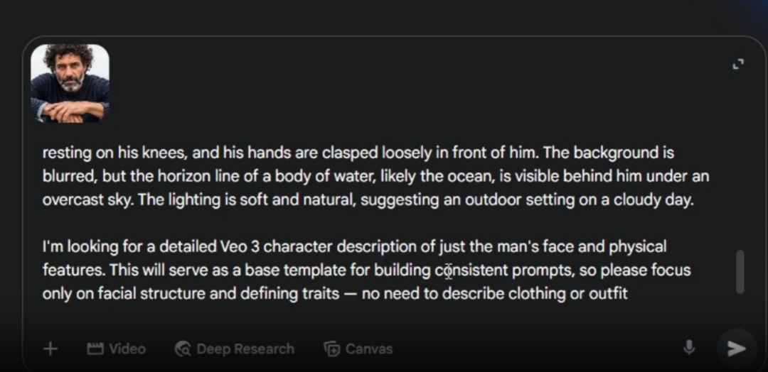 接着,它生成了详细描述,包括面部结构、肤色、眼睛形状、胡须特点,这正是我们在Veo3里保持一致性需要的。