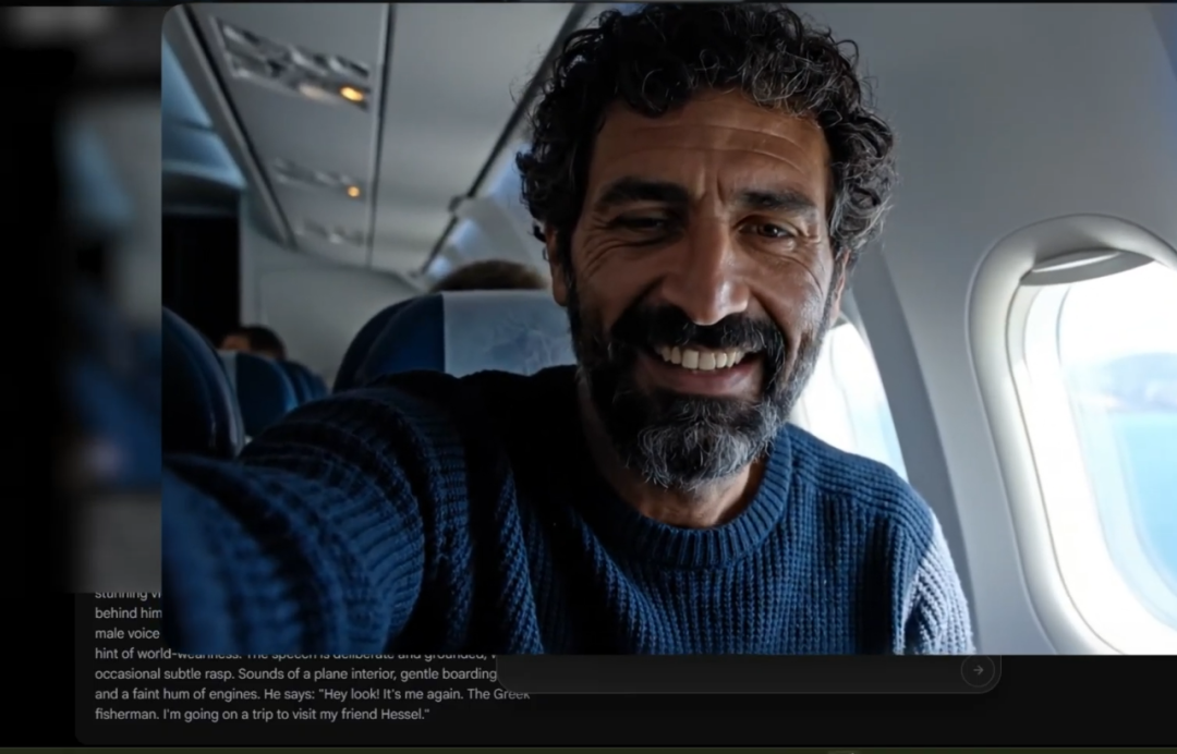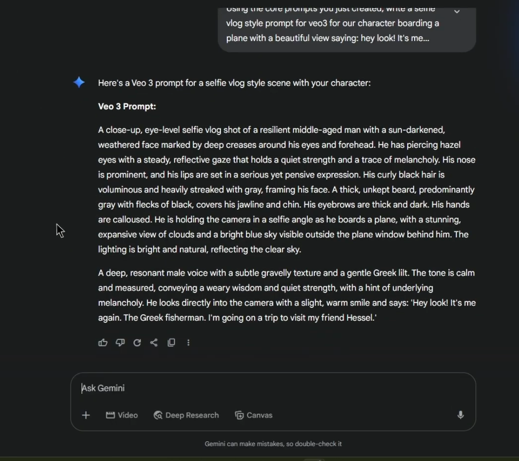 我不想从头写复杂的提示来制作视频,就回到Gemini,让它根据角色模板生成具体提示。我输入“用你刚创建的核心提示,为我们的角色写一个自拍vlog风格的Veo3提示,内容是他登上飞机,看着美丽的风景说‘嘿,又是我,希腊渔夫。我要去看望我的朋友了’”,然后提交。