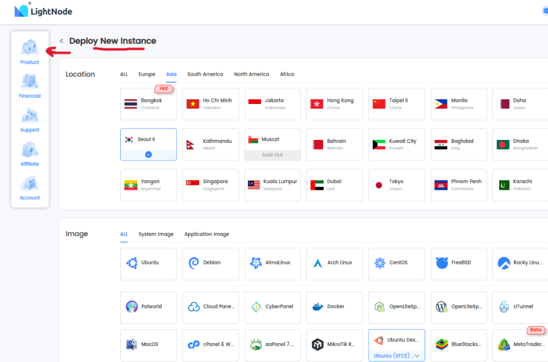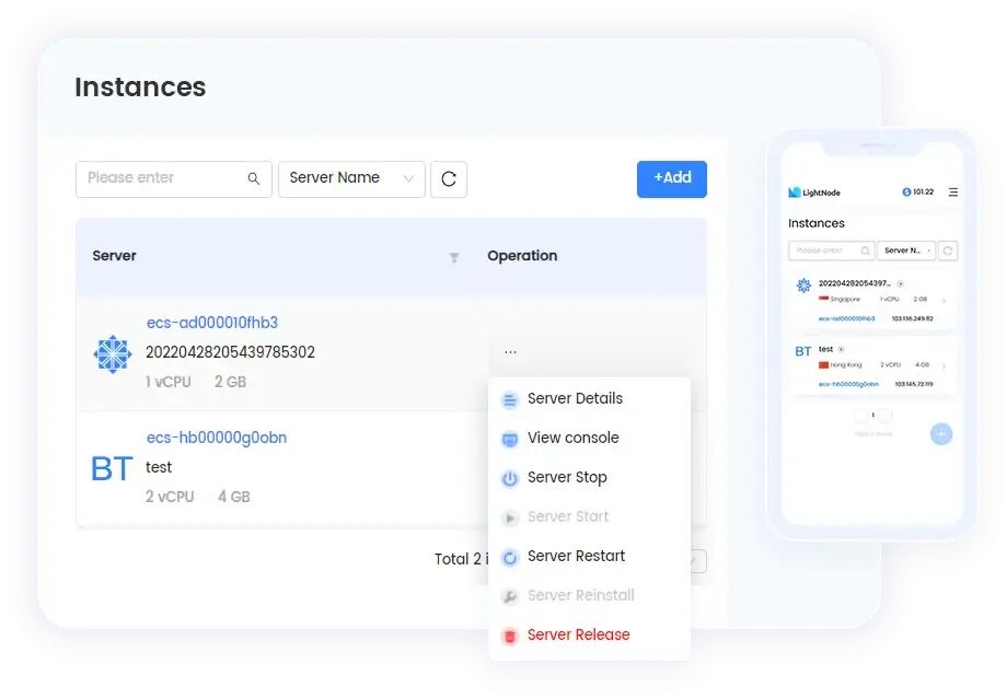 LightNode 实例的部署,也非常简单。点击:产品 – 实例- 添加,选择地区、系统或者应用,再选择配置、设置密码就行,几步就搞定。